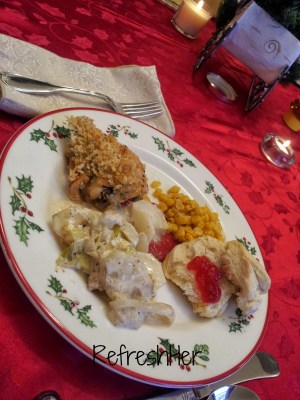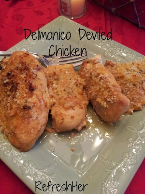We had Delmonico Deviled Chicken as the main course; I shared this recipe a long time ago, but it never made it to the recipe index until now, so I’m going to re-post the recipe today. How in the world the simple combination of ingredients turns a piece of chicken so delicious, is beyond me, but it does! The Chicken has a little mixture spread over it before baking, and it flavors it incredibly! Read on for the recipe.