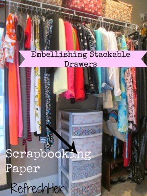 I have a set of stackable drawers in my closet for belts, sock, etc. Because they drawers are clear, it looked messy. So, I took scrapbook paper and lined the front of each drawer with coordinating patterns and colors to give it a neater look.