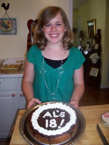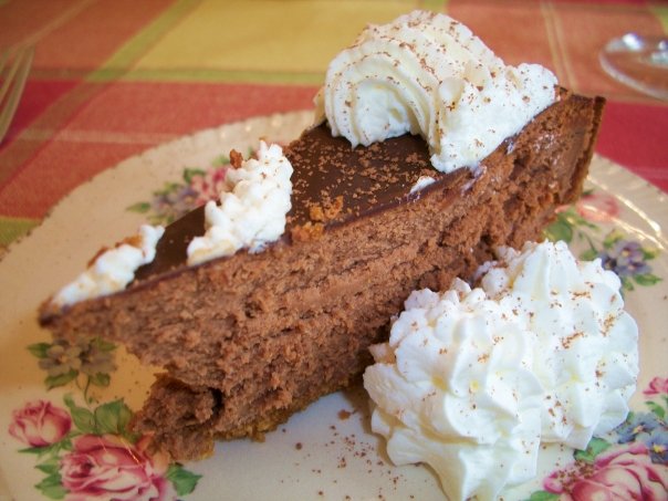 We were celebrating our daughter’s 18th birthday, so I decorated the cheesecake to commemorate the event. When I plated the dessert, I piped two large dollops of fresh sweetened whipped cream next to the cake, then I dusted the plate with cocoa powder. Adding a garnish makes it look like you’ve gone to lots of trouble when you truly haven’t.