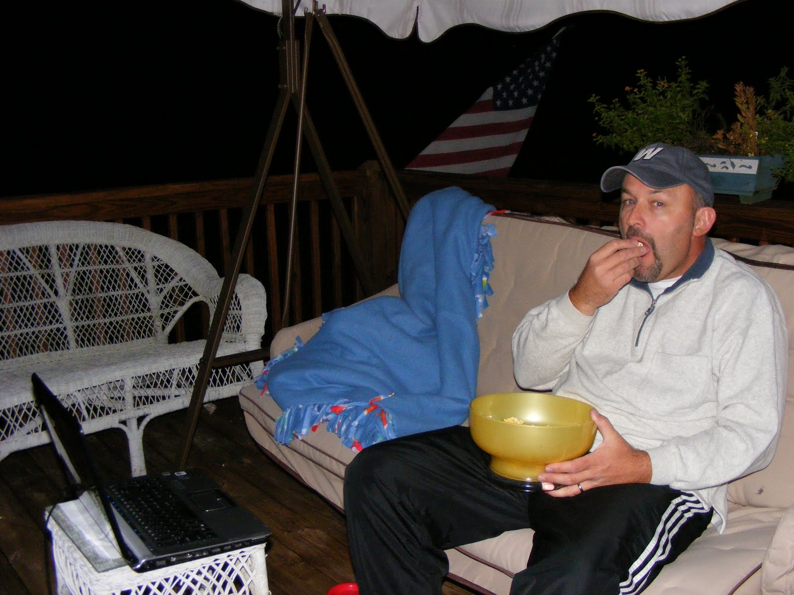 Yesterday was the first really chilly fall day we’ve had. I suggested we have a movie date night on the deck, since we didn’t have a date on Monday due to church activities. At about 8:00 pm we plugged the laptop into the outside outlet and set it on a small table in front of our glider/swing. I popped some popcorn, gathered some warm blankets and we headed outside for a “swing-in movie” (as opposed to a drive-in!). We watched one of my favorites and laughed, munched our snack and sipped hot chocolate. It was just fun being outside on a chilly night and snuggling together to watch a movie.