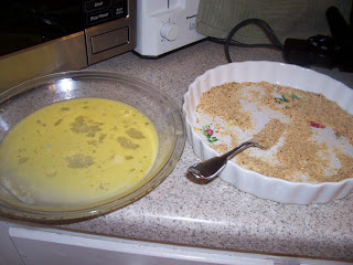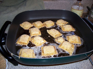 In one bowl mix an egg and 2 tbl. water. In another bowl place a cup of seasoned breadcrumbs. Thaw frozen ravioli of your choice. Dip thawed ravioli in egg mixture, then breadcrumbs.