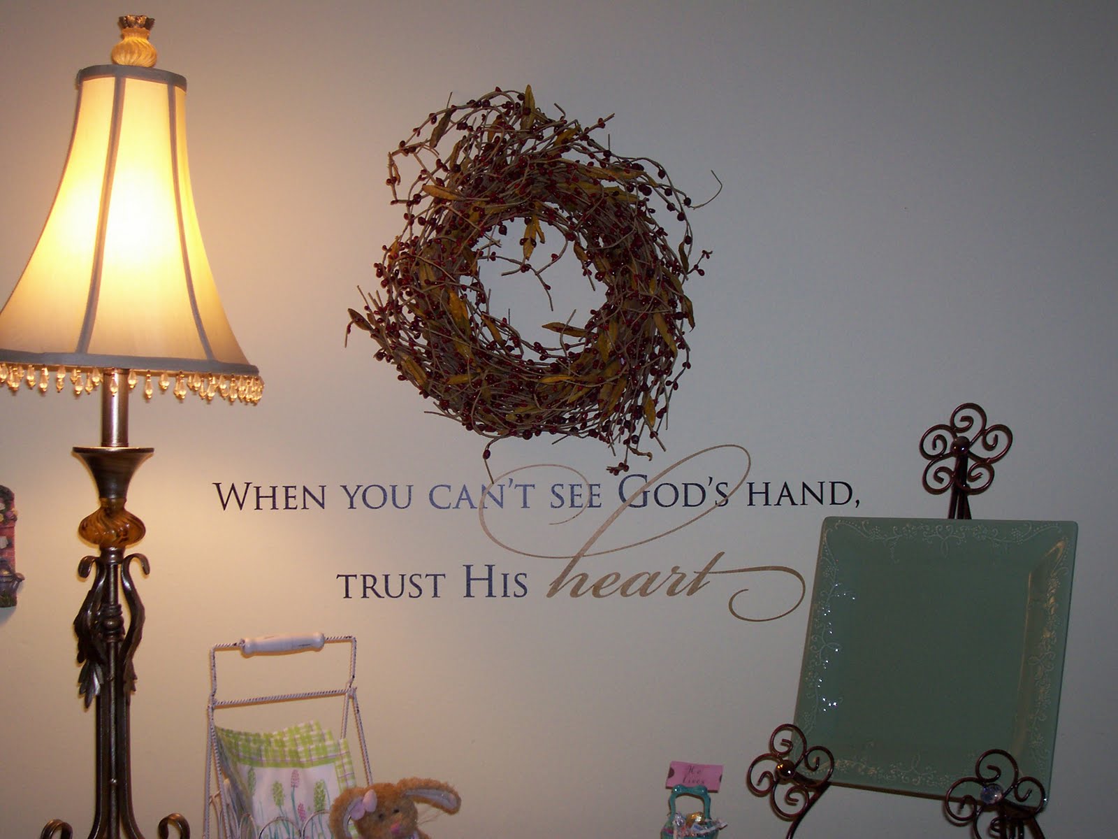 Have you seen these vinyl sayings? I found this one at Hobby Lobby (where else?) π I got it the week they had them half off, so it was $15. All you do is remove the backing paper and press the letters onto the wall. I love the way it turned out. It looks like the hard work of a stencil, but it’s soooo easy!