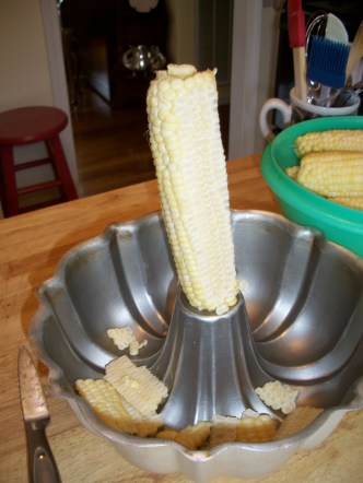 Rather than serving the fresh corn on the cob, I decided to cut it off. I saw this clever trick on the Food network. Place the cooked and cooled corn on the middle of a bundt pan to make cutting it easier. The corn stays put and the cut kernels fall into the pan instead of all over the floor!
