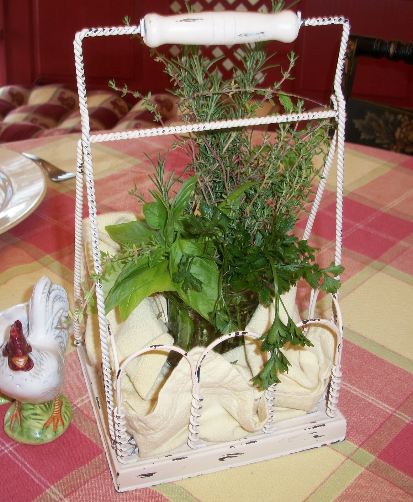 I took some of my fresh herbs and made a bouquet for the kitchen table. It looks and smells so fresh! Thyme, basil, rosemary and parsley and mint will be ready to use for recipes since they’re sitting in water. I love this little wire basket – I use it for lots of different things (thanks, Whitney!)