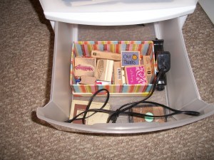 It doesn’t take much to make me happy. I recently bought a seven-drawer cart to hold all my scrapbooking/card making supplies.