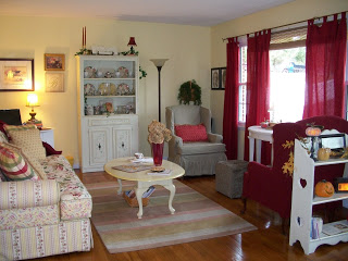 This is my living room as of today – October 13, 2010. It took me a long time to get it to the place that I could say I’m satisfied with the way it looks, but I think I’m there now. It’s the style I like – kind of Shabby Chic/French Country, or my version of it anyway! I’ll take you into the room and show a few parts of my fall nesting.
