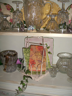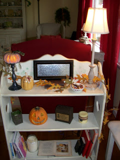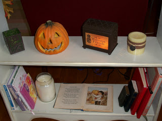 This is the shelf in my entryway. I try to make the decorations on here seasonal and yet keep it in the functioning design I learned about last spring. I have a couple means of lighting – the lamp and the small tin light on the second shelf. The tin light also serves as a fragrance for the room with the potpourri rocks inside. I have Hershey’s miniature candy bars for my guests in the little dish on the top shelf, and a jeweled pumpkin resting on the candle stick.