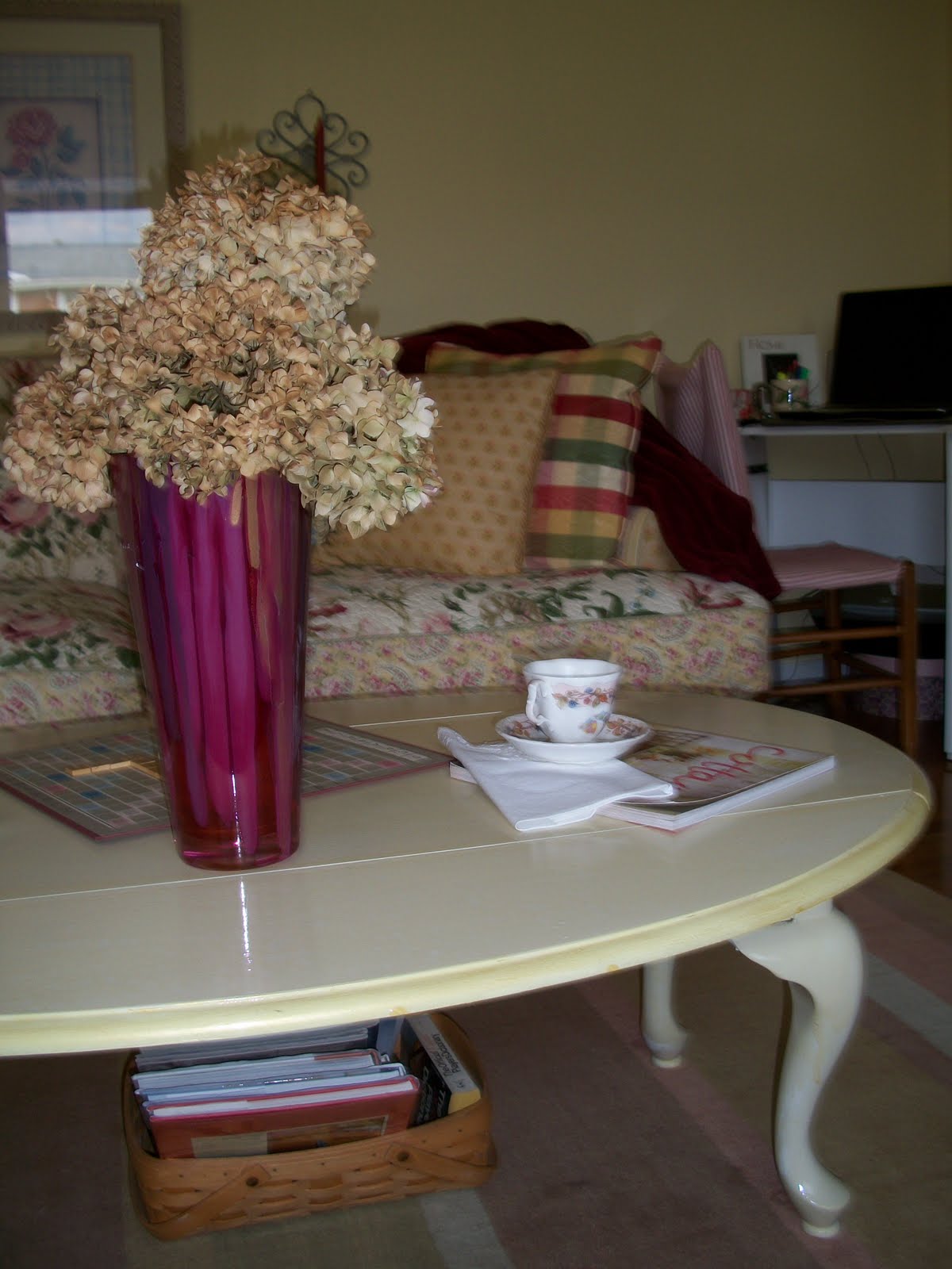 Adding layers to a room give it a cozy feeling. Rugs, quilts, throws, and baskets are all part of the layering. I placed a basket under the coffee table with Fall magazines (and the Scrabble dictionary for those serious players!). I also pulled out my velour throw and placed it across the arm of the couch.
