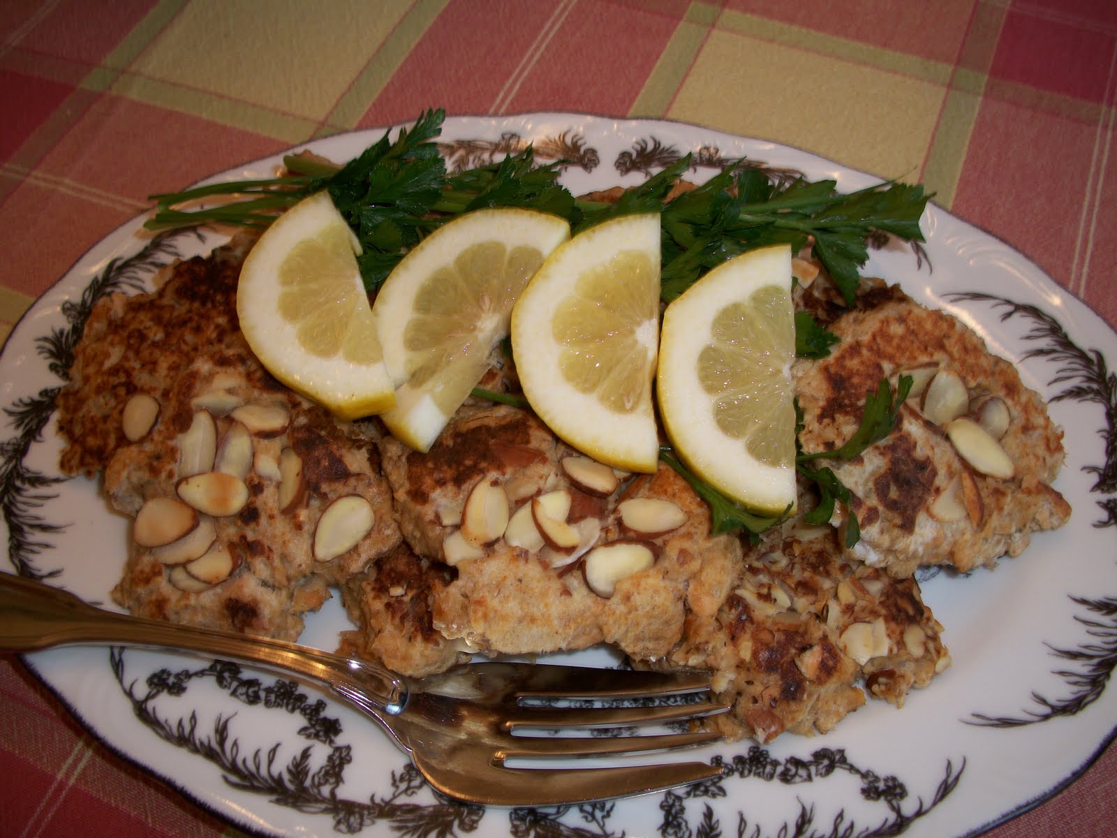 Remove skin and bones from salmon. In large bowl, combine salmon, crumbs, sour cream, egg yolks, chives, salt and pepper; mix well. Beat egg whites until stiff; fold into salmon mixture. On large sheet of wax paper, sprinkle half the almonds. Drop heaping tablespoonfuls of salmon mixture onto almonds; sprinkle remaining almonds over top. In large skillet, heat oil; lift puffs with spatula into skillet. Brown on each side. Serve hot with lemon wedges. Makes 6 servings.