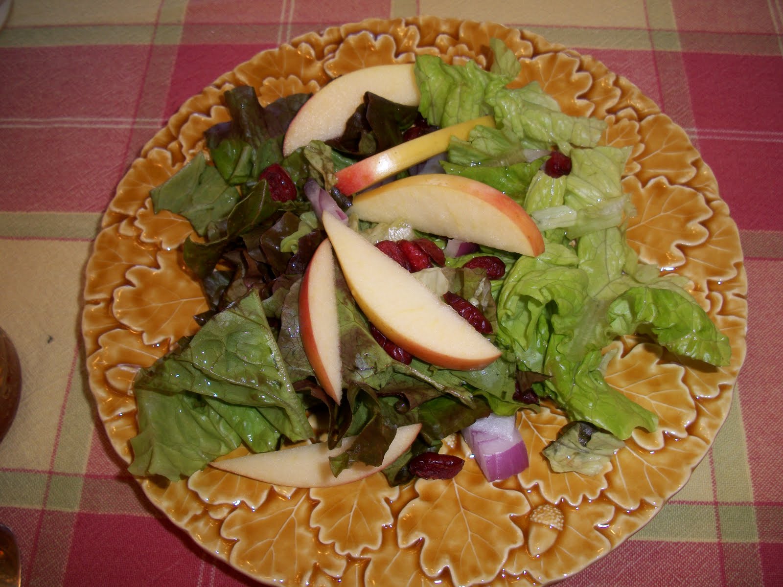 This was my own little dressing, but to make a vinaigrette, you generally mix 1/3 part vinegar to 2/3 part oil. I then added in maple syrup for a little sweetening. The salad was a mix of greens, red onion, Craisins, and apple slices.