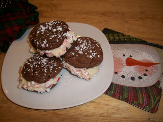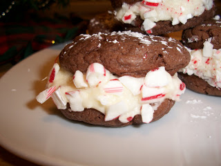 Make up a batch of buttercream icing. Pipe or spread icing onto one cookie. Top with another cookie then roll in crushed peppermint candy. Let icing harden before storing in containers.