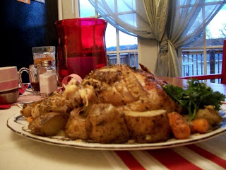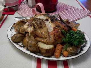 I added quartered potatoes and baby carrots around the chicken. The herbs from the meat seasoned the vegetables. I thickened the pan juices to make a gravy for the meal. Mmm!