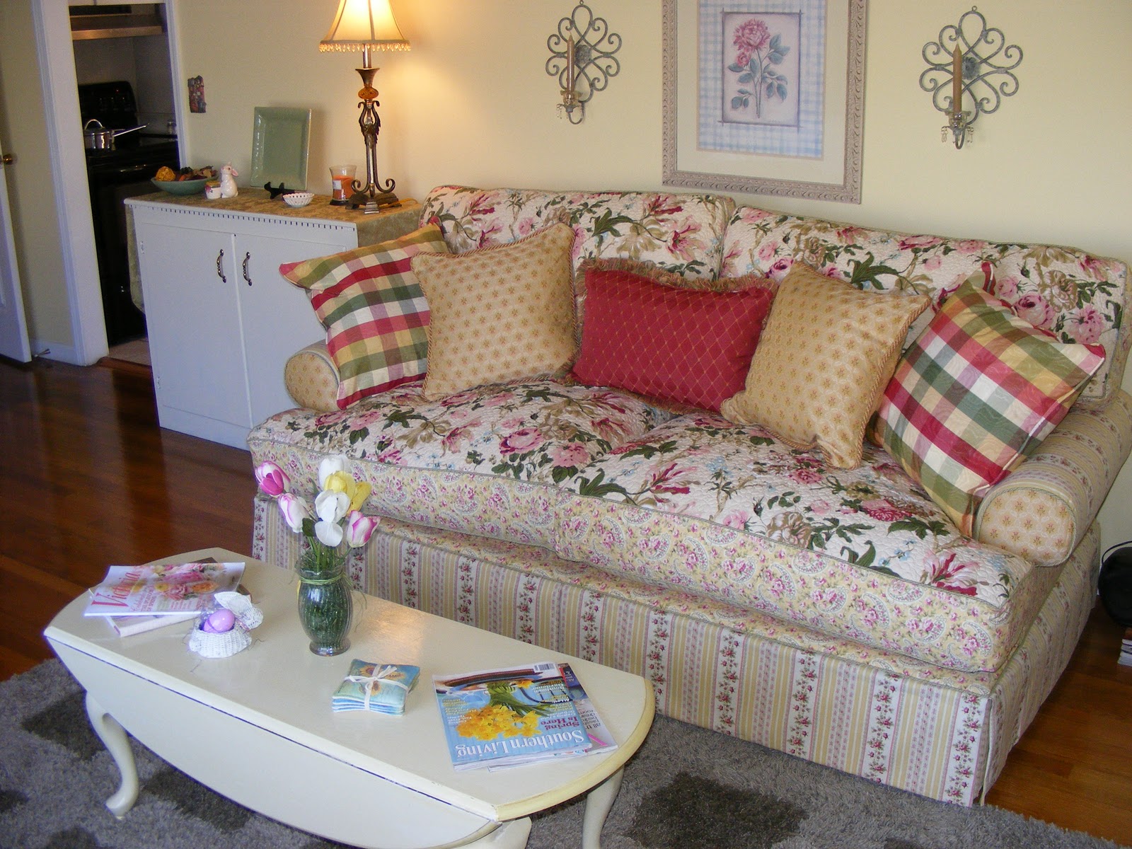This picture of my living room couch was taken right after I got it in 2008. I looked a long time before I found this one that I fell in love with! My dream of a couch and my husband’s dream were in two separate worlds! My dream was with the Shabby Chic/ French Country look in mind; his was man cave visionary! Well, we see who won was more willing to give up their dream! Yeah, he’s sweet.