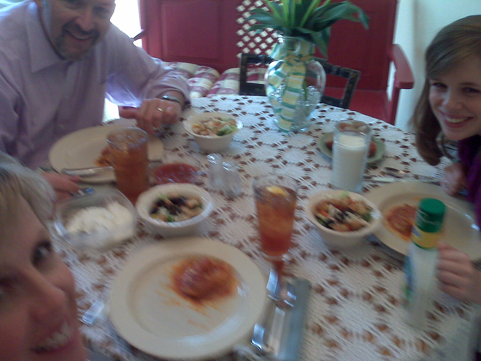 Not only was that the sweetest gesture, that lasagna was also delicious!  I plan on asking her for her recipe so I can share it with you.  She also provided us with a fresh green salad and muffins.  Christy is a blessing, and a true servant.  How I thank the Lord for her kindness.  Here’s a picture (albeit a bit fuzzy) of our dinner that was provided for us.  (My camera died last week – sadness! This pic was taken on my phone.)