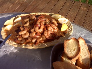 Barbecued Shrimp. I’ really not sure why it’s called “barbecued.” There is no sauce that would remind you of barbecue – just lots of spices. The thing that takes the longest is adding the 11 ingredients to the pan, but don’t let that scare you; they are simple spices that you probably have on hand. There’s nothing weird here! The sauce is pretty spicy if you follow the measurements. I usually use half the paprika, half the pepper and half the hot sauce (it only calls for one teaspoon). I also substitute chicken broth for the cooking wine. This sauce is sooooooo good to dip your bread into! I serve this meal with rice and a salad. It’s become a favorite of ours. I got the shrimp in the freezer section of Walmart and a 14 oz bag was $5! You can’t even eat at a fast food fish restaurant for that price!