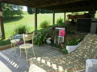 I painted my little soda table chairs yellow. I also brought the chaise lounge to this area, rather than up on the deck. I’d made the slipcover for it a couple years ago. I found outdoor fabric on sale and made a giant pillowcase to slide the cushions into, then added ties to secure it. My hostas do great under here since they get so much shade. I added an old window for some color and pizazz.