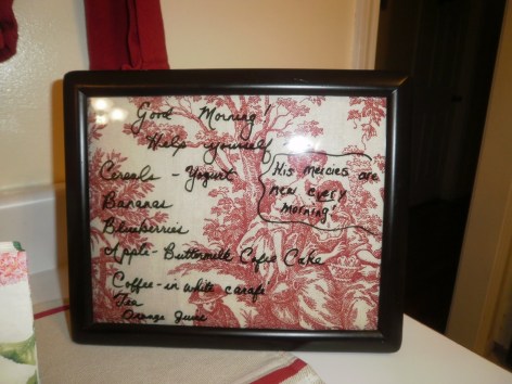 My menu board is fabric in my picture frame. The toile makes it a little busy, but it is readable in person! You and that dry cereal… =)