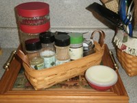 - Make a basket or tray of your baking supplies. Put your most used spices out for easy access. Add your measuring cups and pretty canisters for brown sugar and/or confectionery sugar.