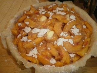 - Roll pie crust into a 12 inch circle. Sprinkle flour over surface. Place crust, floured side down, in a 9 1/2 inch quiche dish. Place peaches in crust.