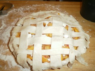 - Roll remaining pie crust into a 12 in. circle; place over peaches. Fold edges under and flute. I did a lattice top on mine – not pretty, but I wanted that “cobbler look”. =)