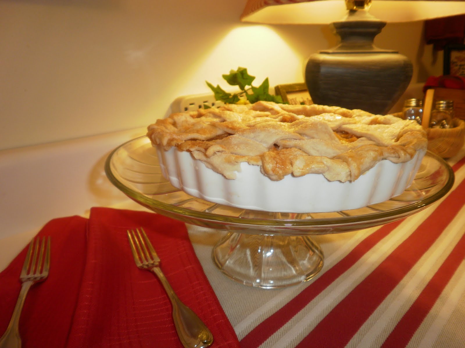 - Roll remaining pie crust into a 12 in. circle; place over peaches. Fold edges under and flute. I did a lattice top on mine – not pretty, but I wanted that “cobbler look”. =)