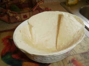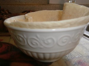 Take the tortilla and place it into a microwaveable bowl. Press it in a bit so it will be the shape of the bowl.