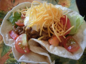 I made up taco mixture with beef – you could also use ground turkey. Add the taco seasoning. Then simply add the lettuce, taco meat, tomatoes, cheese and sour cream to your shell. You could crumble some tortilla chips on top for a little more crunch.