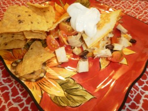 Spray pan with cooking spray. I also like to spray the tortilla shell – it makes them nice and crispy. Place in skillet on medium heat. Add ingredients to one half of the quesadilla, then fold over. Cook until lightly browned. Flip over and brown other side. Serve with sour cream.