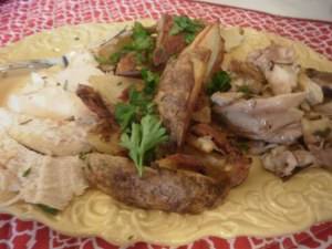 I also put potato wedges in another pan, tossed them with olive oil and roasted them for about 50 minutes in the same oven where the chicken was roasting. This makes the potatoes crispy instead of soft like when you roast them with the chicken. I liked them better this way! Add a little fresh parsley when you take them out of the oven. I added them to the platter with the chicken.