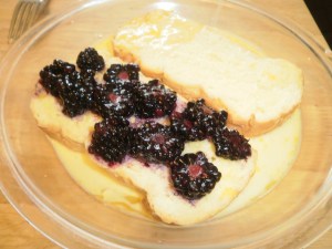 Slice French bread into 1 inch pieces. Dip bread in batter; flip bread and then lay blackberries on top of the bread slice.