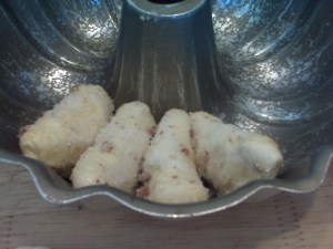 - Dip biscuits in melted butter, and dredge in sugar mixture; place, curved side down, in a lightly greased 12-cup Bundt pan, spacing evenly. Drizzle any remaining butter over biscuits; sprinkle with any remaining sugar mixture.