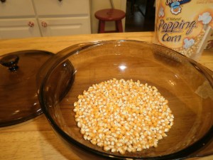 This is how I pop popcorn. It’s so much cheaper (and tastier) than the microwaveable bags you purchase. Place enough popcorn in the bottom of a dish that has a lid. If you want butter, add a couple tablespoons when you place the popcorn kernels in the dish. Microwave on high until the kernels slow down to a few seconds between pops.