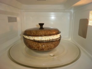 Combine all of the above in 2 quart dish. Bring to a boil in microwave, then cook on full power for 2 minutes. Remove from oven and stir in 1 tsp baking soda.