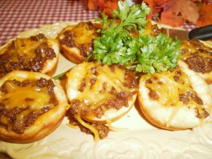 Brown meat; drain fat. Add about 1/2 – 3/4 cup barbecue sauce to meat and stir to combine. Place biscuits in muffin tin. Make a well in each biscuit to hold meat mixture. Spoon meat into biscuit.