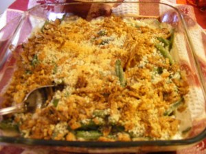 The Green Bean Casserole was also in the new issue of Southern Living. It’s a lightened up version of the traditional green bean casserole. Instead of using Cream of Mushroom soup, you make up a white sauce with a few surprise ingredients added. It’s very good! If you like the southern style green beans, I would suggest using canned French-style green beans instead of the fresh. A topping of Panko bread crumbs and the French fried onions give a nice little crunch on top.