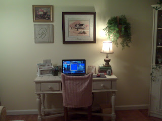 I knew what I was looking for…it had to be the off-white shabby chic kind of furniture because it would be standing in my living room.  I needed a little more table space than I had on my old desk, but it couldn’t be massive.  A couple of drawers would be nice.  It needed to fit into my limited budget.  Up until last week my search hadn’t been too fruitful.  Then, I was wandering through TJ Maxx (where else?) and was in a random department – not the furniture – and looked up and saw this gorgeous desk against the wall.  As soon as I saw it I knew I had found the look I wanted!  It met all my requirements!  Now, to see if the price was right.  Yes! Even $50 under! Take a look…