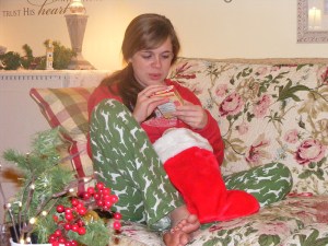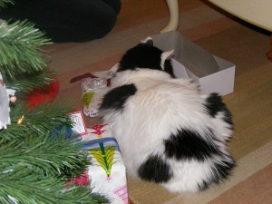 While we open gifts, Liza Jane always tries to find a box to nest in. She tried this oblong one, but her size wouldn’t let her inside. Hmmm, maybe Weight Watchers is in her new year’s resolution….