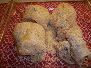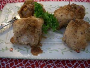 Place chicken breasts in salt water and refrigerate overnight. In one bowl, mix lemon juice and melted butter that has cooled. In another bowl mix bread crumbs, cheese, salt, pepper and garlic. Drain chicken. Dip chicken in butter mixture and in bread crumb mixture, and roll – jelly roll style and bake in 350 degree oven for 1 hour. (You could bake these without rolling them up; they will take less time that way!)