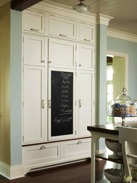 | Can I just say I love this?! Chalkboard paint on one cabinet adds a pop of something different and makes you feel at home! I think a can of this paint is in my future! |
