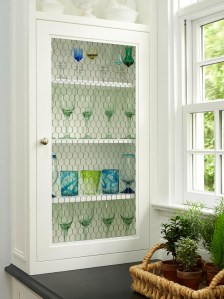 | Chicken wire fronts show off pretty glassware. I’m sure this is more cost-effective than glass! My rooster dishes would be adorable behind this! |