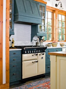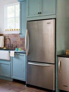 | Distressing the cabinets after painting softens the look of the stainless appliances. |