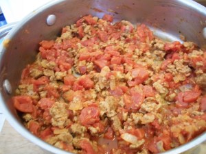 I made a couple of changes in the recipe this time, using Turkey sausage in place of the ground beef and 2% milk insead of whole milk.