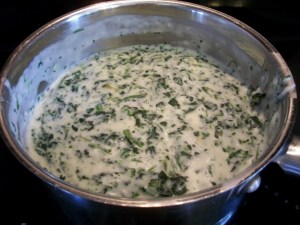 6. For cheese sauce, melt 1/4 C butter in a medium saucepan (I used 2 Tbl.) over medium heat. Stir in flour, remaining 1/2 tsp salt, remaining 1/8 tsp pepper and nutmeg. Cook and stir until bubbly. Wisk in milk; cook na dstir until sauce thickens. Cook and stir one minute more. Remove from heat. Stir in 1 C mozzarella and 1/4 Parmesan. Stir until smooth. Stir in spinach. Set aside.