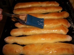 After bread sticks have cooked for 6 or 7 minutes, brush the bread sticks with half the butter mixture.