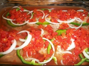 Place in roasting pan. Arrange onion and pepper slices on top of roast, then pour tomatoes over top. cover and bake at 250 degrees for at least 4 hours, more if you have time. check occasionally to see if it needs water. d(Okay, you cant’ do this if you’re at church, but I just make sure it has plenty before I leave.) Makes its own gravy.