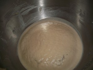 Add to yeast mixture. Add melted butter. Mix with paddle attachment of stand mixer or wooden spoon until fully combined.