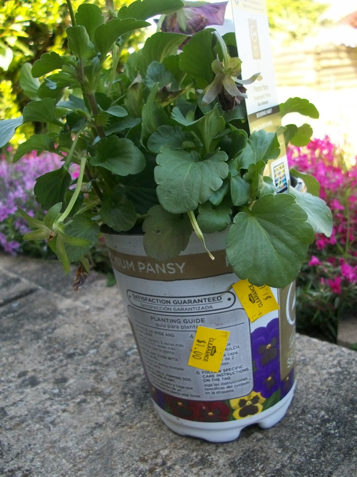 I had wanted to make this purchase sooner – the pansies for my flower boxes, but somehow whenever I was in town, going to Lowe’s was out of the way. Finally last Saturday I got up early and made a trip there with the express purpose of brightening up the winter look of the window boxes out front. As I neared the landscape area, I scanned the flowers and saw only summer varieties for those brave enough to set them out before the usual “Mother’s Day safety zone.” I made my way over to a sales clerk and inquired if I was too late for pansies. “There are some over in the side lot where all the ‘destressed’ plants are.” As I made my way over, I had to chuckle when I saw the sign, “Destressed Plants.” The word destress means to place strain or stress on something. I had thought she meant distressed, signifying that the plants suffered from the weather, etc. At any rate, these plants were all marked to $1! In your mind’s eye, you’re probably seeing brown wilting leaves and pathetic stems, but these weren’t like that at all! Here’s one of the pots I bought…