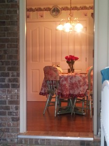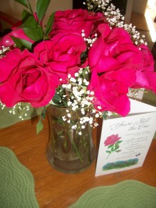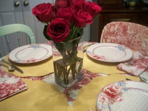 | My mom’s table and red roses. |