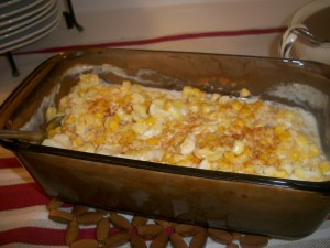 The dish of corn isn’t very attractive, after getting all bubbly in the oven, but don’t let that fool you or discourage you from trying this simple side dish. It’s on the order of a special creamed corn. Very good! I mixed the whole thing up on Saturday night, then popped it into the microwave a couple of minutes, then the oven for about 10 minutes at 350 degrees.