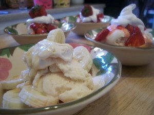 We had gotten some local strawberries this weekend, so for dessert I just did a simple version of Strawberry shortcake and ice cream sundaes combined. One of my guests can’t eat strawberries, so I also had bananas and caramel as an option.